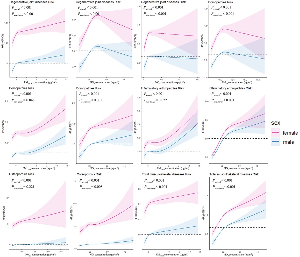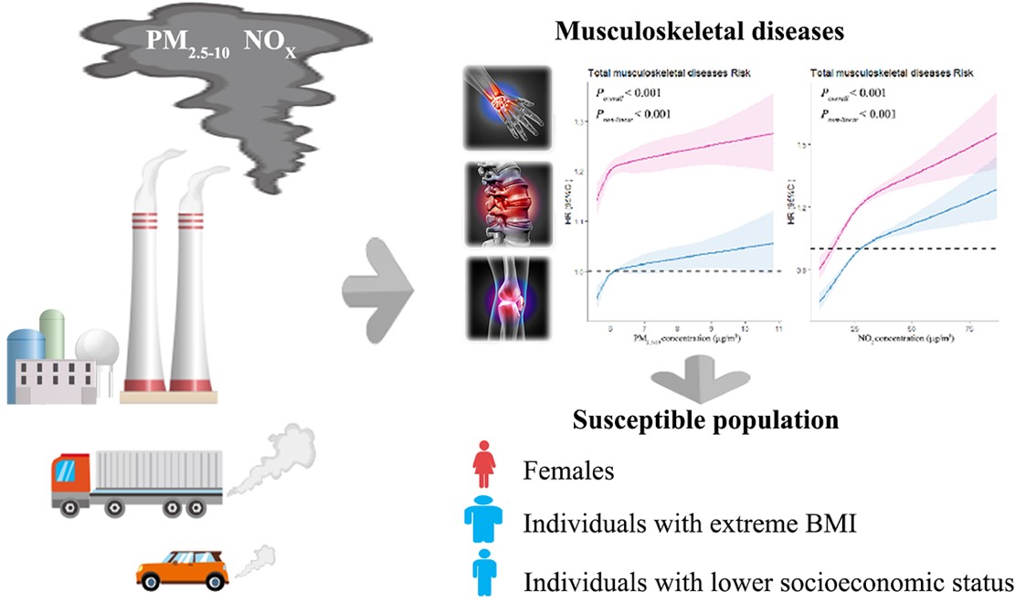随着全球人口老龄化加剧,骨关节疾病的患病率不断上升,迫切需要明确相应的环境危险因素,以便制定针对性预防措施。空气污染是当前影响人群健康的重要危害因素之一,但其与骨关节疾病风险的相关性尚不明确。为此,西安交大公共卫生学院研究人员利用大规模前瞻性队列,通过构建空气污染评分,系统评估了长期空气污染暴露对六大类骨关节疾病风险的影响。研究发现空气污染综合评分与骨质疏松症风险增加显著相关。在单个空气污染物中,PM2.5和PM2.5-10对骨关节疾病风险增加的影响最为显著,其中PM2.5暴露可显著增加骨质疏松症的风险,PM2.5-10暴露可显著增加炎症性关节病的风险。