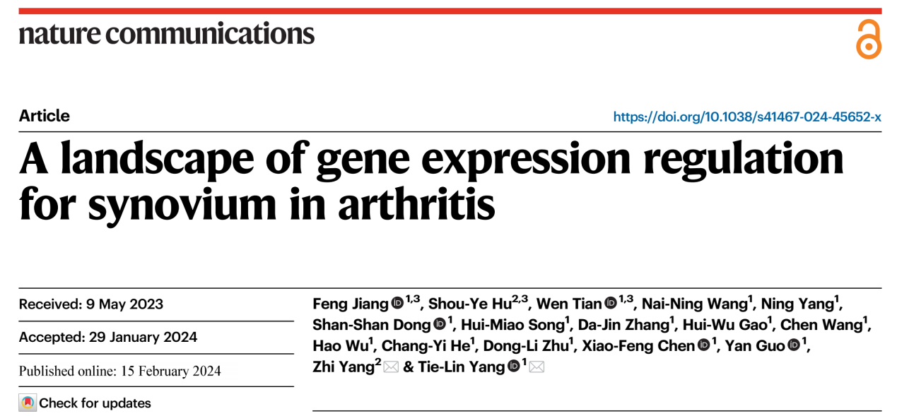 该研究成果于2024年2月15日,在《自然通讯》(Nature Communications)发表了题为《关节炎滑膜组织基因表达调控图谱》(A landscape of gene expression regulation for synovium in arthritis)的论文。论文通讯作者为西安交通大学生命学院杨铁林教授和附属红会医院关节翻修病区杨治主任,西安交通大学生命学院博士生江丰、红会医院副主任医师胡守业和生命学院博士生田文为该论文共同第一作者。西安交通大学生物医学信息工程教育部重点实验室和生命学院为该论文的第一和通讯单位,西安交通大学附属红会医院为共同通讯单位。
