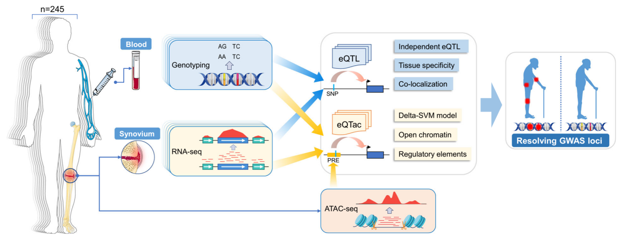 关节炎是一种常见的关节病变,主要表现为滑膜增生、软骨变性及软骨下骨增生,造成关节功能丧失和生活质量下降,在60岁以上人群发病率超过50%,全球范围内有数亿人受到影响。全基因组关联研究(Genome-wide association study, GWAS)已鉴定数百个与关节炎相关的风险变异,但90%以上位于基因组非编码区,其调控功能和致病机制尚不明确。表达数量性状基因座(expression Quantitative Trait Loci, eQTL)能够鉴定易感变异与基因表达的关联,是解析GWAS非编码区变异位点功能的有力工具。然而,eQTL分析具有明显的组织特异性,滑膜作为关节的重要组成部分,是炎症性关节病的主要靶组织,目前还没有大规模滑膜组织的eQTL数据,为解析关节炎风险位点的作用机制带来了极大挑战。
