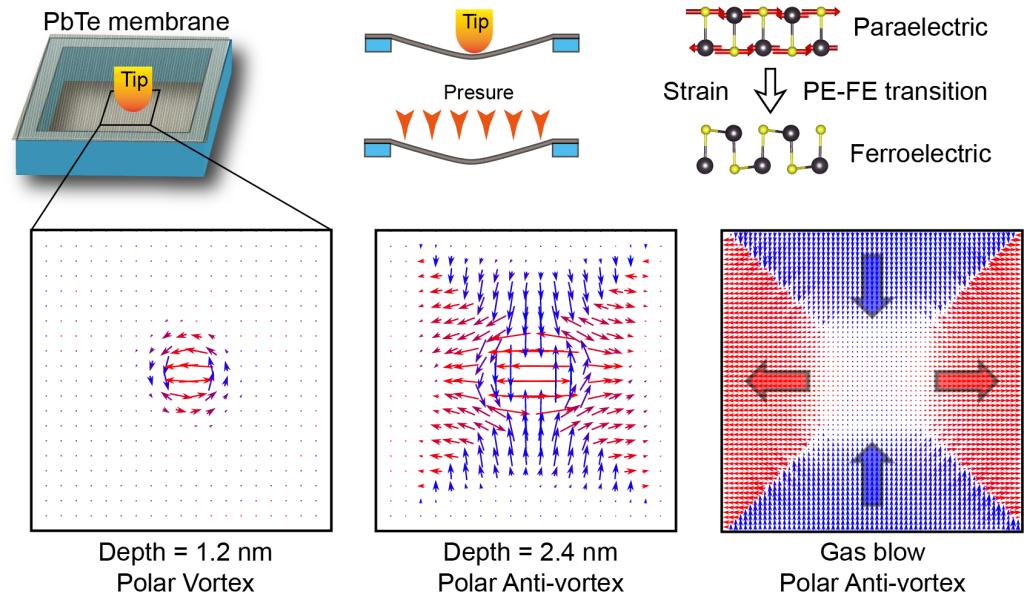 近日,西安交通大学材料学院的邓俊楷教授课题组与航天学院的刘益伦教授和墨尔本大学的刘哲教授通力合作,通过多尺度模拟方法将铁电极化拓扑结构及其调控拓展到二维铁电材料中。首先,研究团队利用第一性原理计算,发现二维PbX(X = S,Se,Te)材料可通过应变诱发“顺电-铁电”相变,并确定了材料的“应变-极化”相图;随后,基于二维PbX材料具有优异的面外屈曲变形的特点,研究团队采用基于深度学习势的大规模分子动力学,模拟“纳米压痕”实验,发现二维PbX材料在复杂应变场条件下可诱发“类斯格明子”的极化涡旋拓扑结构;最后,利用有限元模拟,通过设计不同几何压头的纳米压痕或压力鼓泡等机械载荷导致的复杂应变场,在二维PbX材料中实现了可回复的极性涡旋、反涡旋和通量闭合畴等多种二维曲面铁电极化拓扑结构。研究工作证明了利用复杂应变场,可在柔性二维铁电材料中,设计各种可逆的极化拓扑结构,有望为开发基于新型二维铁电材料的高密度存储器和传感器等功能器件提供新的思路。
