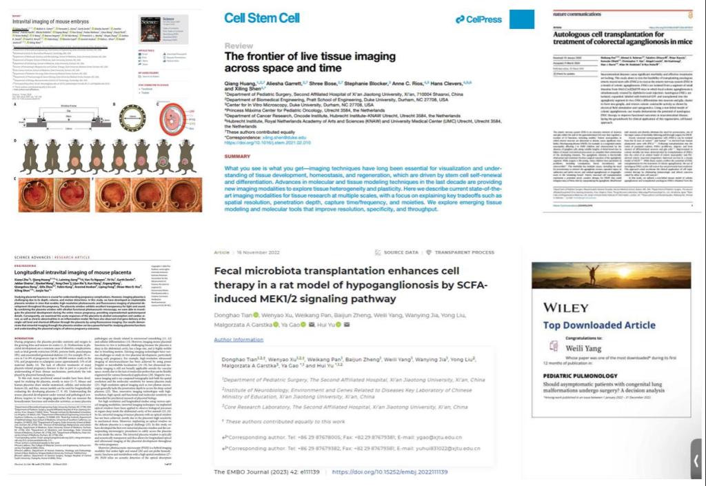 多年来,二附院小儿外科高亚教授领导的研究团队一直致力于相关研究领域的深入研究和技术创新,在多个研究方向取得了丰硕成果,取得了10余项国家自然科学基金的支助,黄强研究员、潘伟康副主任医师、余辉副研究员、田东浩助理研究员等分别以第一作者和(或)通讯作者已连续在《科学》、《细胞干细胞》《欧洲分子生物学学会杂志》《自然通讯》和《科学进展》等国际知名期刊发表多篇原创性文章。此外,博士研究生杨薇粒发表在《儿童肺病学》文章被WILEY出版社评为TOP Downloaded Article。这些研究成果反映了二附院小儿外科在先天畸形的诊疗发生发展、干细胞移植、再生医学等母胎研究领域的水平。今后,小儿外科将继续深耕母胎医学研究领域,为持续推动学科和医院建设贡献小儿外科力量。