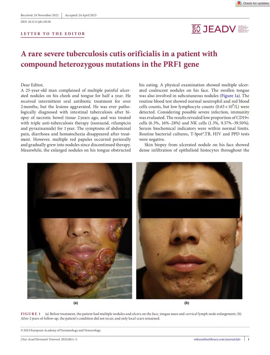 2023年5月13日,西安交大二附院皮肤病院耿松梅教授团队在《欧洲皮肤性病学杂志》(JEADV,IF:9.22)在线发表了题为“A rare severe tuberculosis cutis orificialis in a patient withcompound heterozygous mutations in the PRF1 gene”的最新临床研究成果。朱龙飞主治医师为第一作者,耿松梅教授为通讯作者。