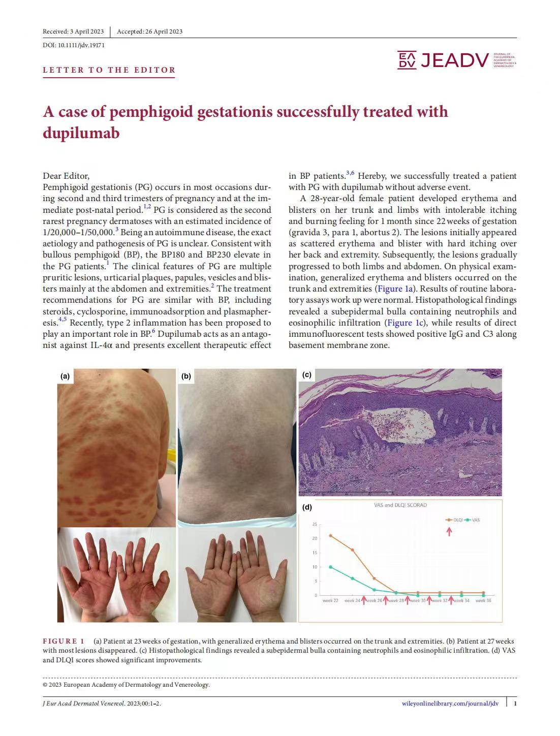 该病例是国际上第3例、国内首例报道的使用度普利尤单抗治疗妊娠疱疹的病例。经过一年随访,证明了其安全有效性后,文章撰写投稿,并被JEADV迅速接收发表。