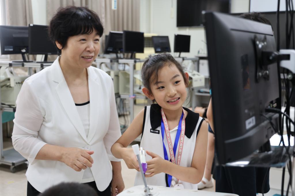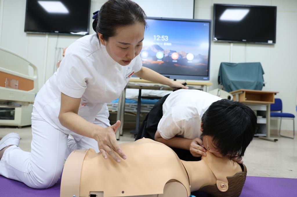 在临床技能实验教学中心,孩子们围坐在心肺复苏模拟人旁,认真地听着急诊科护士长邱晓娟关于心肺复苏术和海姆立克急救法的讲授。“心肺复苏要按压多少下?”“每分钟100—120次!”大家迅速地回答出正确答案,邱晓娟护士长还鼓励孩子们动起手来,尝试在模拟人身上找出按压部位,并不断重复口诀加强记忆,熟练掌握这项能在关键时刻够挽救生命的技能。