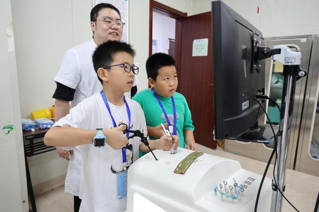 在腔镜模拟训练教室,普通外科主治医师尚皓手把手教孩子们体验了外科手术基本操作。看似简单的“夹豆子、穿线”,在腔镜下仿佛变成了不可能完成的任务,孩子们切身体会到了外科医生们的不易,只有日复一日的刻苦训练,才能登上手术台,为更多人解除病痛。