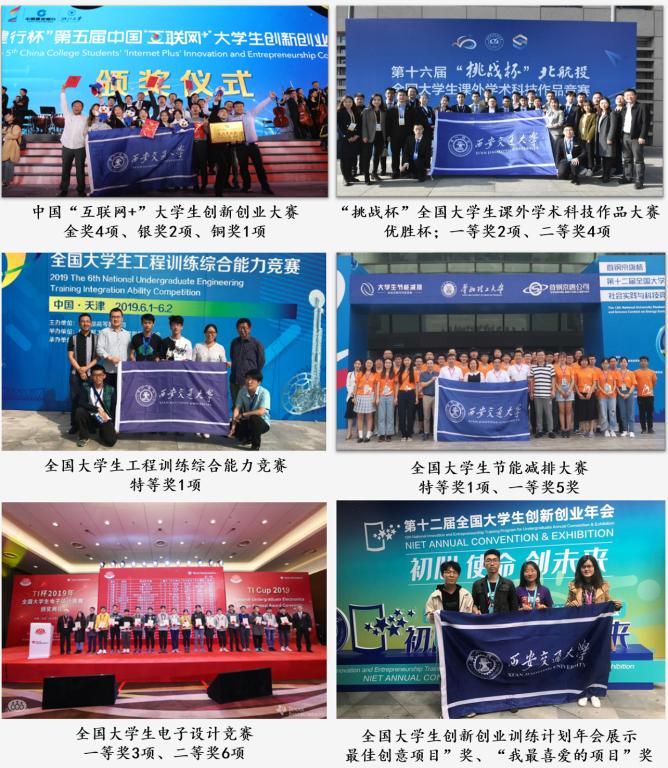 2019年,在学校的大力支持和师生们孜孜不倦的努力下,西安交大在参与榜单内的近20项比赛中成绩斐然,获得各类奖项160项。特别是在中国“互联网+”大学生创新创业大赛获得金奖4项,获金奖数并列全国第三位;在“挑战杯”全国大学生课外学术科技作品竞赛获得一等奖2项并捧得“优胜杯”;在 ACM-ICPC大赛中获得亚洲区预赛金奖6项,再次冲入全球总决赛;在全国大学生节能减排大赛获得特等奖1项、一等奖5项,位列全国第一;在全国大学生电子商务“创新、创意及创业”挑战赛获得特等奖1项,并列全国第二位。