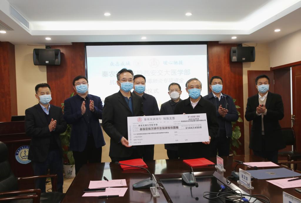李彬表示,西安交通大学医学部积极响应国家号召,第一时间选派经验丰富、精力充沛、能打硬仗的精英医务人员,以最美“逆行者”的形象奔赴湖北武汉,全力抢救新冠肺炎危重症患者,诠释了交大人的家国情怀和使命担当。同时严格落实省级定点医院的功能定位和收治任务,全力做好新冠肺炎病例诊疗救治工作,忠实守护了三秦大地。疫情发生后,秦农银行党委以强有力的政治责任和社会担当,坚决服务于我省和全国阻击疫情工作大局,已累计为6户疫情防控企业提供授信支持2.65亿元,并向省市6个重点项目授信21.5亿元,全力支持重点项目落地和相关企业复工复产。为表示秦农银行和全行员工的诚挚敬意,向西安交通大学医学部捐款300万元人民币,用于关于新型冠状病毒开展科研攻关,加强传染源、传播致病机理等理论研究、临床诊治及人才建设。同时,秦农银行员工个人自发捐赠10.4149万元人民币,主要用于西安交大第一、第二附属医院援鄂医疗队医护人员生活补贴,以表达对他们的关心爱护。衷心期盼西安交大医学部早日取得抗疫研究成果,衷心祝愿抗击疫情一线的医务工作者圆满凯旋,衷心祝愿守护三秦大地的定点救治任务出色完成。也祝愿秦农银行与西安交通大学的业务合作不断加深,为陕西三个经济发展再做新贡献。
