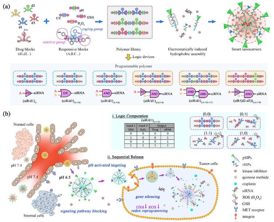 针对这一难题,西安交通大学生命学院仿生工程与生物力学研究所(BEBC)徐峰教授、张鹏晖博士联合湖南大学谭蔚泓院士、南京大学朱俊杰教授,受“乐高”积木“即插即用”的启发,开发了一类新型的可编程化学工具——环境响应分子砌块库,用于构建具有逻辑门的智能聚合物和纳米载体,通过生物逻辑运算,实现了肿瘤内多种药物的分层释放,提高了肿瘤治疗的精准性。该工作为智能材料的设计提供了新的可编程工具,在智能药物的设计和递送、细胞微环境工程、干细胞编程分化等领域有良好的应用前景。相关研究成果以“可编程聚合物库用于构建具有逻辑门的环境响应纳米载体(A programmable polymer library that enables the construction ofstimuli-responsive nanocarriers containing logic gates)”为题发表在国际权威期刊 Nature Chemistry 。