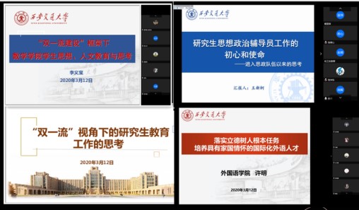 研究生是科研的生力军,是高端人才的预备队,也是创新港建设的主要力量,在双一流建设背景下,如何发挥思政工作生命线作用,构建与创新港校、院、所相适应的一流研究生教育管理新模式、新机制和新载体显得尤为重要。3月12日下午,研工系统召开了一场别开生面、形式新颖的思政论坛,各学院党委副书记、研究生工作负责人和全体研究生辅导员70余人在各自办公室通过线上视频会议方式共商“双一流”建设框架下研究生工作改革创新。校党委副书记宫辉参加研讨,研工部部长、研究生院副院长李秀兵主持论坛。