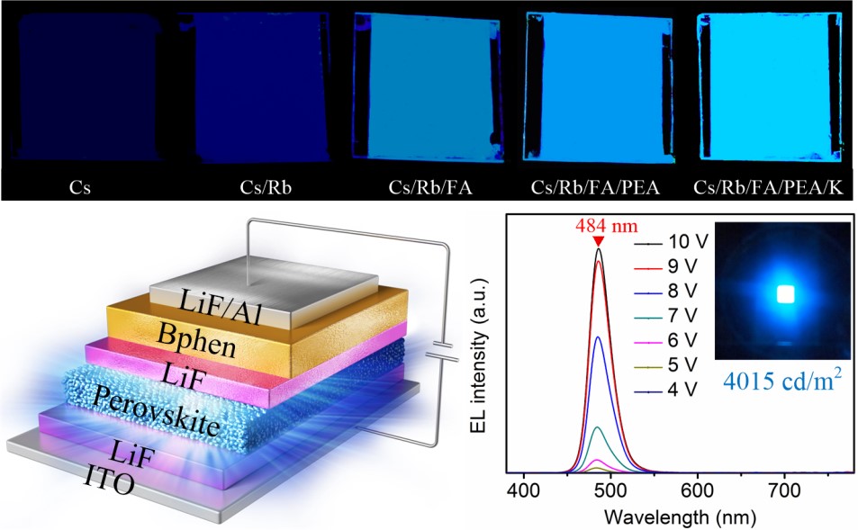 针对以上蓝光PeLED器件中存在的问题,西安交大吴朝新教授团队采用调制“鸡尾酒”的方式,在无机钙钛矿CsPb(Cl/Br)3中引入多重阳离子Rb/FA/PEA/K,协同作用,各司其职,解决蓝光钙钛矿材料固有缺点(辐射复合效率低及稳定性差等)的同时,通过离子诱导结晶改善成膜质量,制备出兼具高荧光量子效率(~17.1%)、高平整度及高稳定性的多重阳离子钙钛矿(Cs/Rb/FA/PEA/K)Pb(Cl/Br)3薄膜;结合课题组提出的“绝缘层-钙钛矿-绝缘层”结构,即将钙钛矿薄膜置于两层超薄绝缘层LiF之间,通过载流子隧穿效应,诱导载流子进入钙钛矿晶体内实现有效辐射复合,该结构能够有效减少针孔引起的漏电流,抑制激子淬灭。最终,基于多重阳离子钙钛矿薄膜的蓝光PeLED器件在电致发光波长484 nm处实现了最大发光亮度4015 cd/m2,最大EQE为2.01%的出色性能。最为重要的是,该器件表现出优异的工作稳定性,其连续工作状态下的半衰寿命超过300 min。