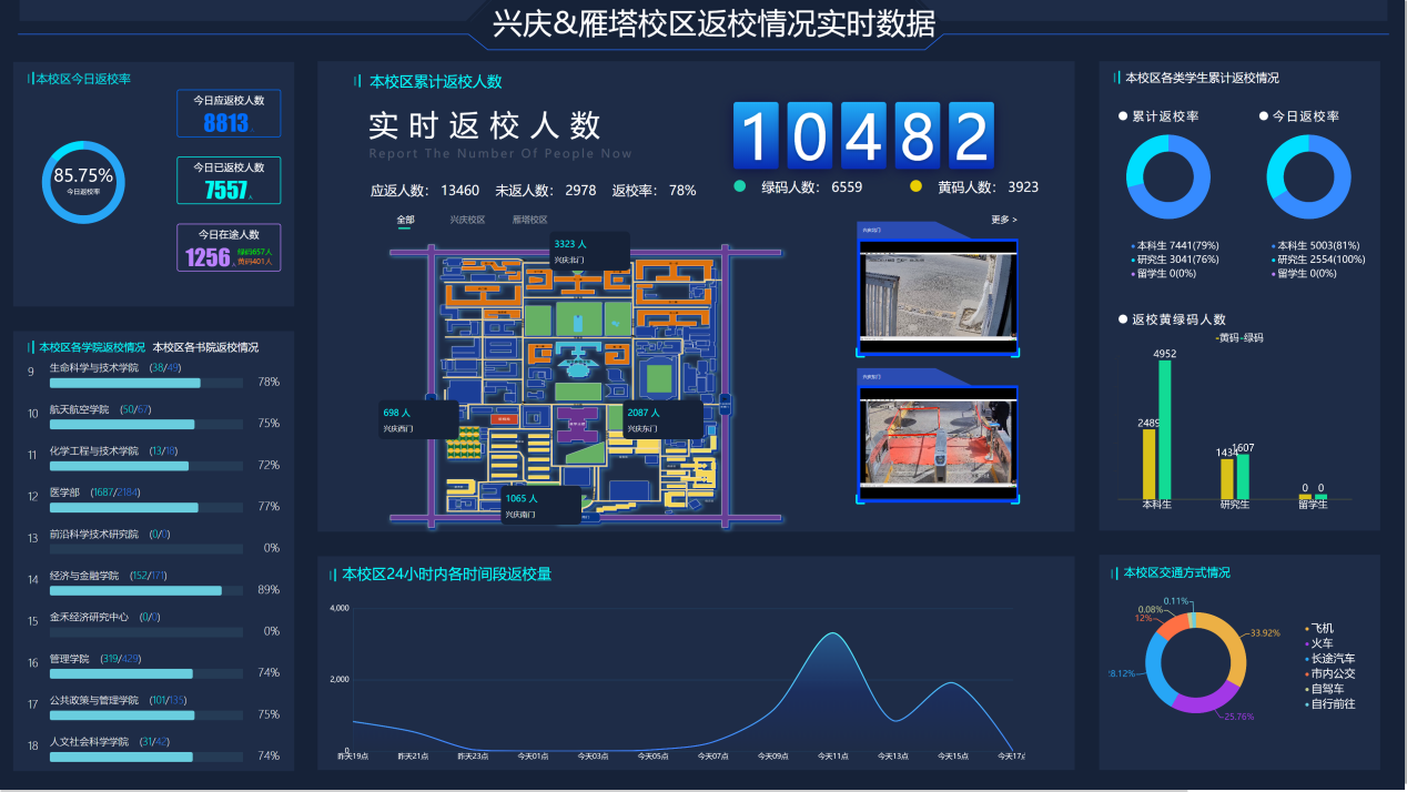 在IOC,网信中心徐墨副主任介绍了疫情防控期间学生返校管理系统建设情况,现场讲解返校数据统计及智慧管理功能。为切实保障学生平安返校,在学校统一指挥和领导下,网信中心开发了学生返校智慧管理系统,系统包含20个功能点、汇聚6大数据、面向7类用户、支持2种终端访问。大屏统计数据根据学生基本信息、学生健康档案、返校行程安排、到校情况等,生成多维度、多样化的数据统计报表,利用大数据进行挖掘和分析,实时生成各校区返校人员统计数据,为学校实时、全面、精准掌握学生返校情况提供支持。