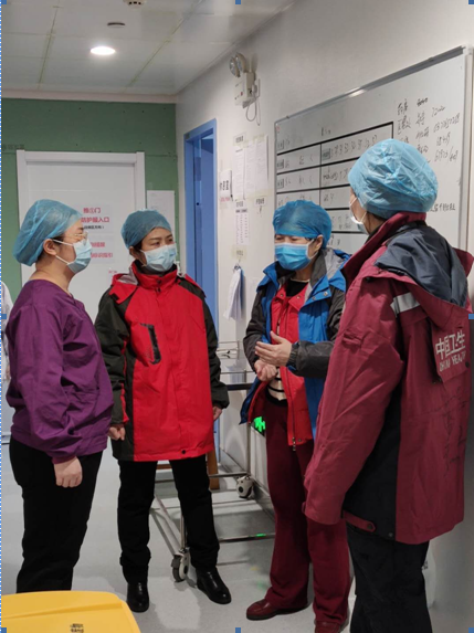 同组的几位战友,她们乐观、努力、坚强、有责任感,这些都深深感染着我。当大家全副武装做好防护进入隔离病区,已经没有了最初的陌生与恐慌。在同济老师们的指导下,我们不再手忙脚乱,逐渐熟悉了每一班次的工作流程。我们工作时要克服厚重的防护服、护目镜带来的不便,为患者进行静脉输液、胰岛素注射、皮下注射、血糖监测、吸氧,呼吸机观察、院感防控、三餐发放、打开水、晨晚间护理、核对医嘱、巡视病房……忙碌的身影穿梭于病房的每一个角落。工作中,大家是彼此分工,又互相协助,共同努力做好本班次的医疗护理工作,甚是感动。