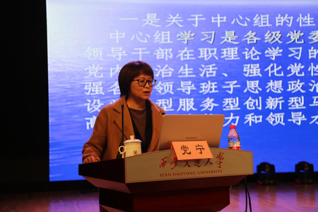 党宁同志长期从事党的创新理论研究、宣讲和全省党委(党组)理论学习中心组协调管理工作。她从理论学习中心组学习规则、2020年度政治理论学习要点、理论学习中心组学习目前存在的问题和进一步加强理论学习的要求等四个方面做了系统的辅导。