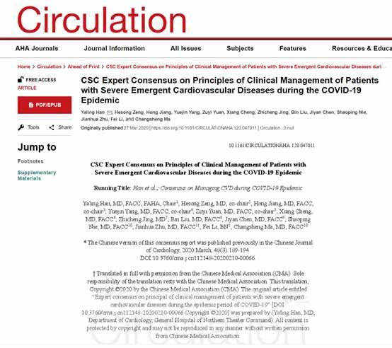 该文发表后,其救治流程与方案得到美国心脏协会(AHA)的认可并约稿,英文版投稿后两天在全球心血管病领域顶尖期刊《循环》(Circulation)上在线发表,为全球的心血管临床医生提供了新冠肺炎疫情下的心血管病急危重症诊疗方案。《循环》(影响因子:23.054)为美国心脏病协会会刊,在JCR期刊分区中位列心血管专业(CARDIAC & CARDIOVASCULAR SYSTEMS)同类期刊中的影响因子排名首位。