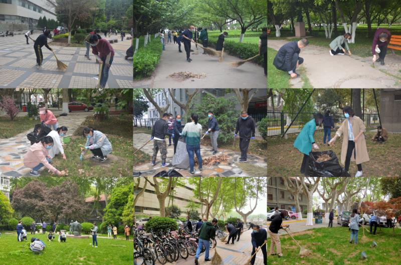 各党支部书记、部门负责人纷纷带头,共产党员、入党积极分子、职工积极响应,大家分工合作,有的拿起笤帚清扫地面,有的拿着竹耙清理草丛中的落叶,有的拿起抹布清理公告牌上的尘土、有的拿着铲子清理路边杂草,每个人都用自己的双手打造了干净、清洁的校园环境。从西花园到东花园、从樱花东道到樱花西道、从思源活动中心到留学生公寓、从行政主楼到康桥餐厅旁,处处都能看到忙碌的身影。每位参与劳动的管理服务者此时此刻都是一面鲜红的旗帜,都在用实际行动体现勤勉务实良好形象。