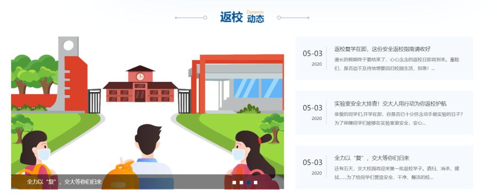5月6日起,学校根据教育部和陕西省关于2020年春季学期开学工作有关要求,安排学生分期分批有序返校。为加强正面宣传,及时更新相关返校信息,切实保障学校返校工作稳步推进,西安交通大学返校专题网正式上线。网站开设“返校动态”“常见问题”“抗击疫情健身教程”“我要咨询”“疫情动态”等5个栏目,为学生推送返校相关动态,提供常见问题及抗击疫情健身教程,同时学生可留言进行提问,网站将安排相关人员及时答疑解惑。