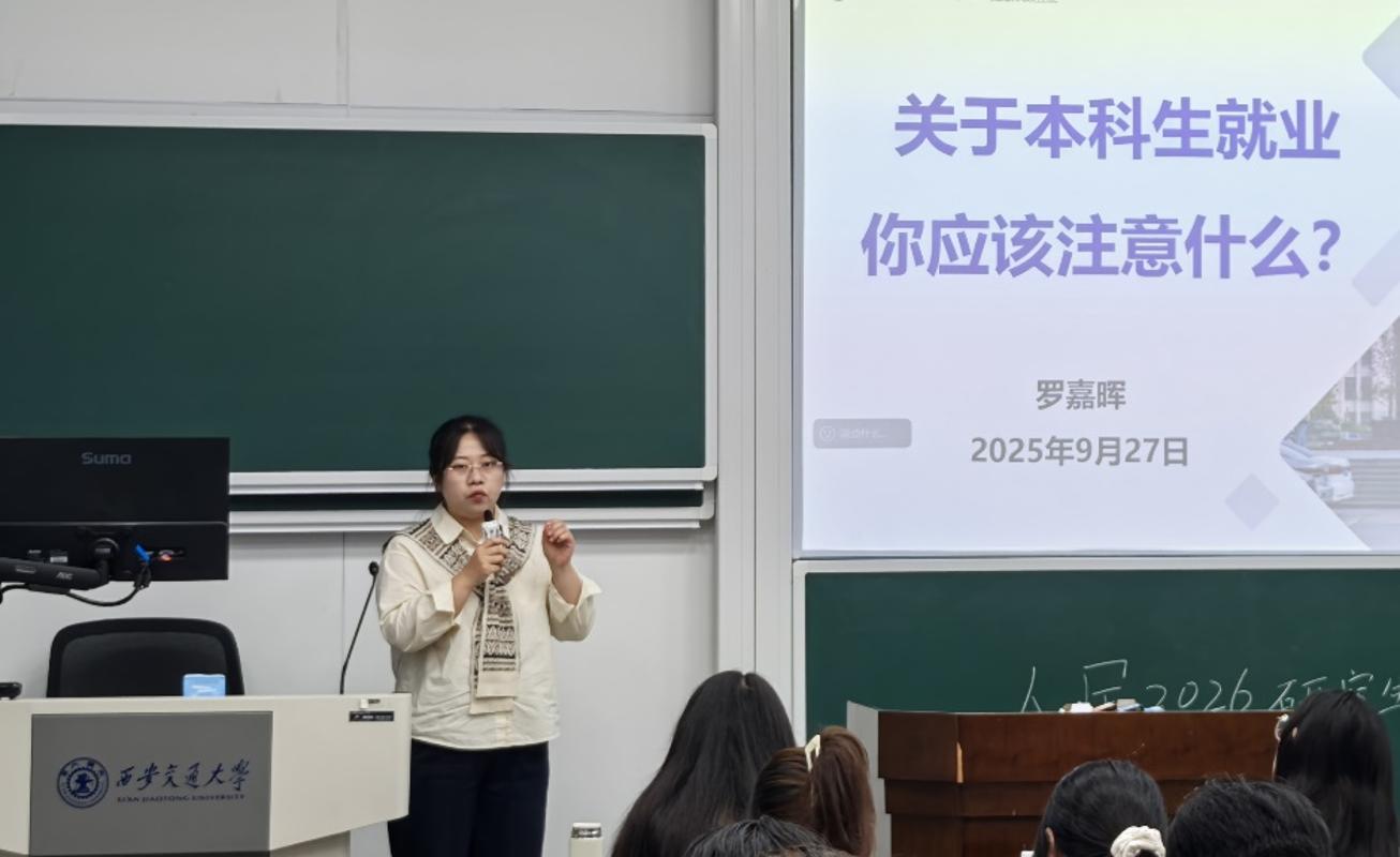 罗嘉晖介绍了文治书院往届学生就业去向情况,并给同学们讲解了2026届毕业生就业工作的时间安排和就业签约等流程,提醒同学们要积极行动,避免焦虑。书院、学院和学校的就业平台给学生提供了丰富的求职信息资源,她建议同学们充分利用这一宝贵资源,有问题及时跟书院、学院相关老师交流沟通。