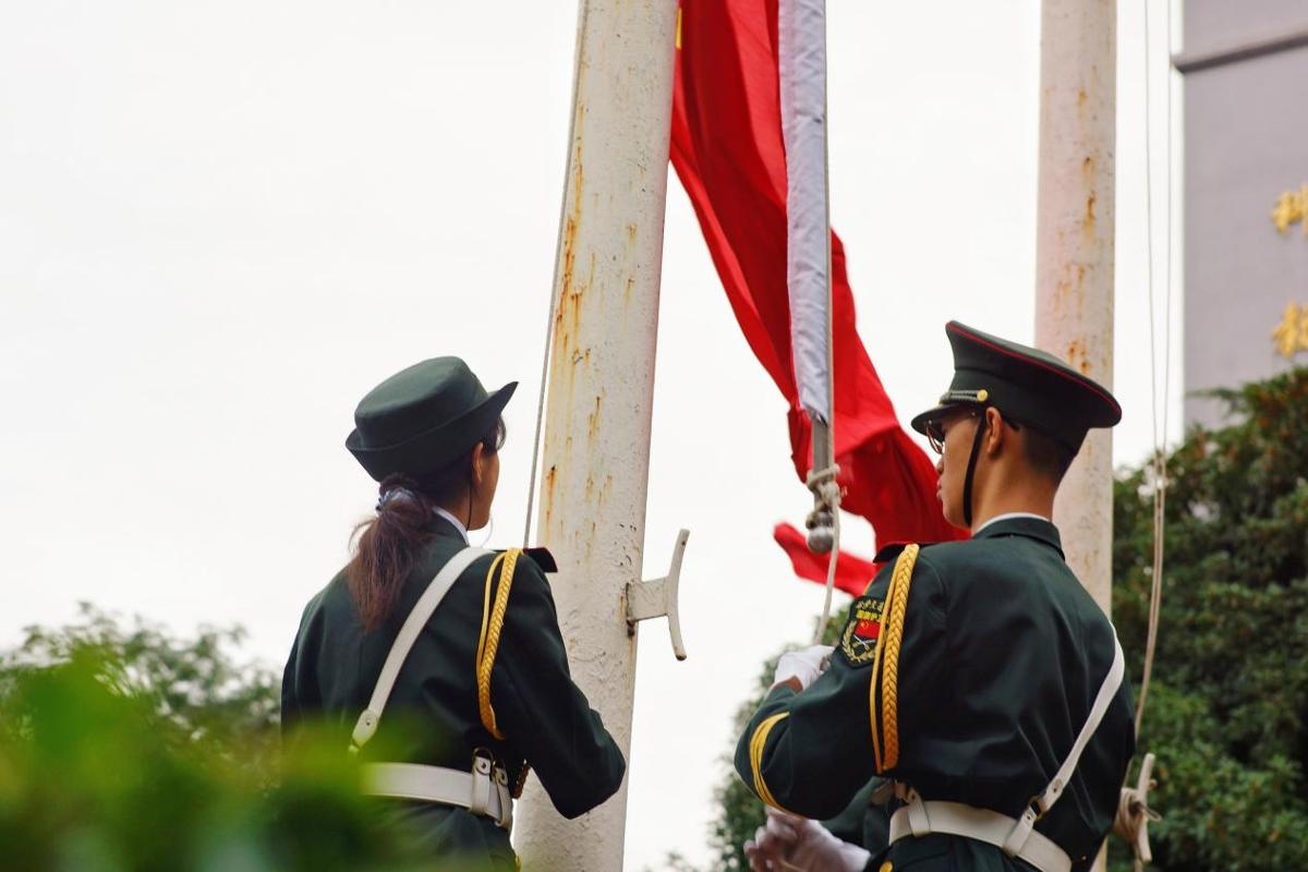 在激昂的《义勇军进行曲》中,五星红旗冉冉升起,迎风飘扬。现场师生庄严肃立,高声齐唱国歌,向国旗行注目礼。以最崇高的敬意,为亲爱的祖国献上西安交大最诚挚的祝愿。
