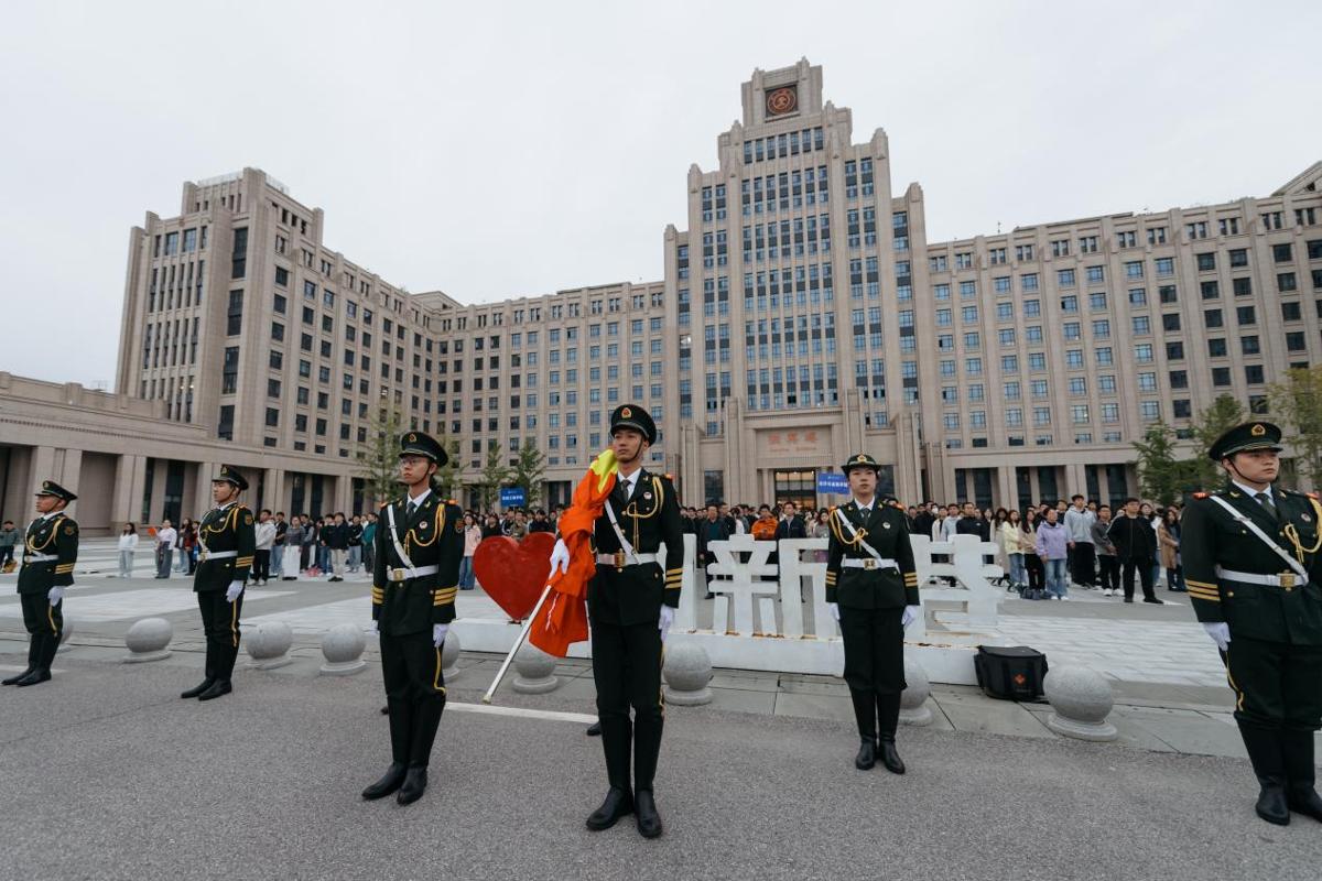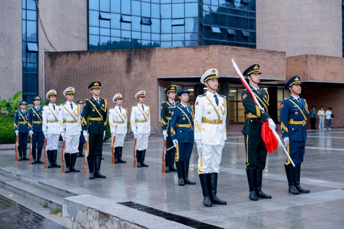 七时整,升旗仪式正式开始。西安交通大学国旗护卫队队员们步伐坚定、气势如虹,以整齐划一的队列护卫着五星红旗迈向升旗台。