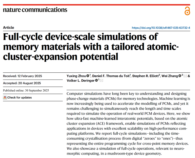 近日,《自然·通讯》(Nature Communications)发表了题为《相变存储材料量专用原子簇扩展机器学习势函数及其全周期器件尺度模拟》(Full-cycle device-scale simulations of memory materials with a tailored atomic-cluster-expansion potential)的研究论文。该工作的第一作者为牛津大学周宇星博士,通讯作者为西安交通大学张伟教授和牛津大学Volker L. Deringer教授,合作者包括Daniel F. Thomas du Toit博士和Stephen R. Elliott教授。该工作的所有数据均已开源。