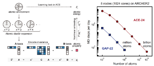 为攻克这一难题,西安交通大学金属材料强度全国重点实验室材料创新设计中心(CAID)与牛津大学研究人员开展合作,开发了一种基于“原子簇扩展”(Atomic Cluster Expansion, ACE)框架的超快机器学习势函数。该工作建立在团队前期开发的GST-GAP机器学习势函数的基础之上(Nature Electronics 2023, 6, 746–754),通过引入ACE框架和额外的领域特定数据集迭代流程,使得新的GST-ACE势函数在不损失原子受力与运动精度的前提下,将模拟效率进一步提升,达到GST-GAP的400多倍,可支撑百万原子纳秒级或十亿原子皮秒级的分子动力学模拟。