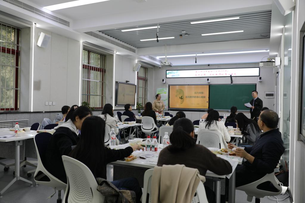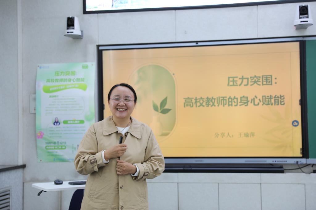10月15日,教师教学发展中心举办主题为“压力突围:高校教师的身心赋能”教学研讨午餐会,邀请人文学院王瑜萍副教授作专题分享,吸引了来自各学院24位教师参与。本次午餐会聚焦高校教师群体面临的压力困境,旨在帮助教师深入剖析压力根源、掌握科学应对方法,实现身心赋能与职业成长,教发中心副主任高洋主持活动。