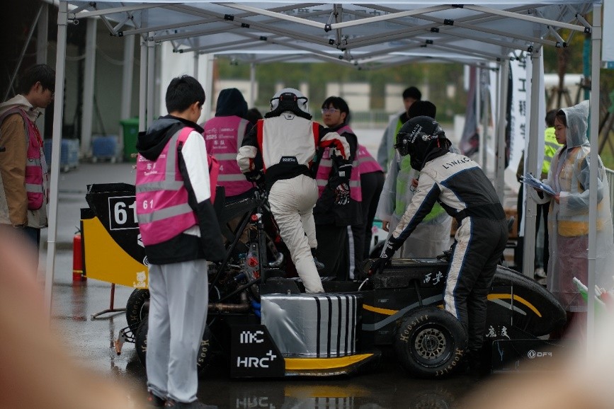 开赛第一天,队长廖博新带领四位车手进行了队员登记和车手注册。作为赛事安全的重要保障,车手逃生要求车手在五秒内完成一系列操作离开车舱。毅行车队顺利完成了车手逃生测试,XR25B的单体座舱与快拆方向盘设计极大提升了车手逃生的速度,较以往提升20%。